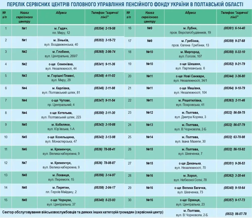 Отримати консультації щодо пенсійного забезпечення, надання страхових виплат, соціальних послуг, житлових субсидій і пільг та з інших питань, що стосуються діяльності Пенсійного фонду, можна особисто та за телефоном у сервісних центрах ГУ Пенсійного фонду України в Полтавській області.