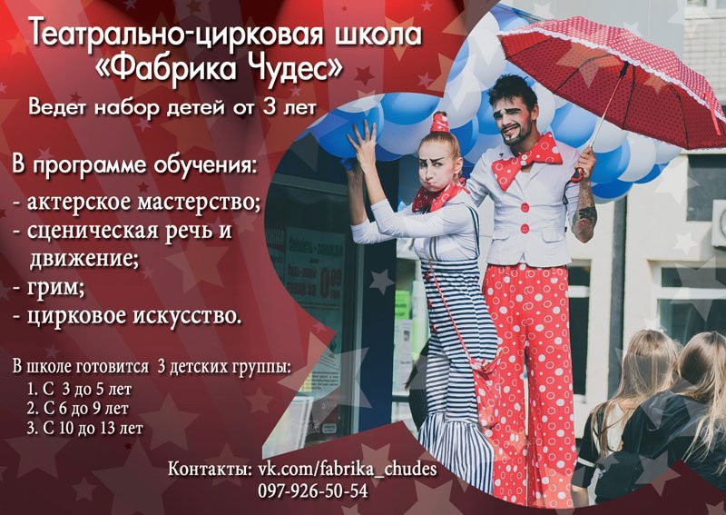 Театрально-цирковая школа – это соединение двух самых ярких и между собой граничащих видов искусства. Безусловно, каждый сможет найти в этой сфере, что-нибудь интересное для себя, потому что в первую очередь <<Фабрика чудес>> – это творческая мастерская для раскрытия потенциала, заложенного в каждом взрослом и ребенке.