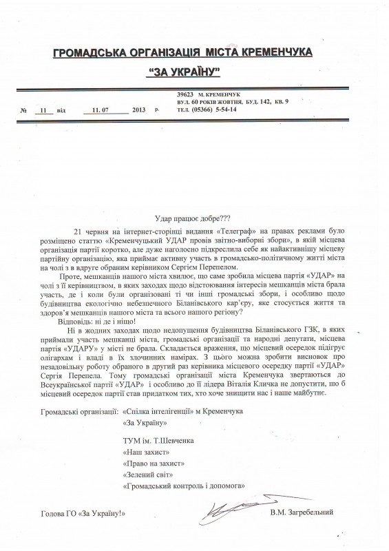 Ні в жодних заходах щодо недопущення будівництва Біланівського ГЗК, в яких приймали участь мешканці міста, громадські організації та народні депутати, місцева партія «УДАРУ» у місті не брала. Складається враження, що місцевий осередок підігрує олігархам і владі в їх злочинних намірах. З цього можна зробити висновок про незадовільну роботу обраного в другий раз керівника місцевого осередку партії «УДАР» Сергія Перепела. Тому громадські організації міста Кременчука звертаються до Всеукраїнської партії «УДАР» і особливо до її лідера Віталія Кличка не допустити, шо б місцевий осередок партії став придатком тих, хто хоче знищити нас і наше майбутнє.