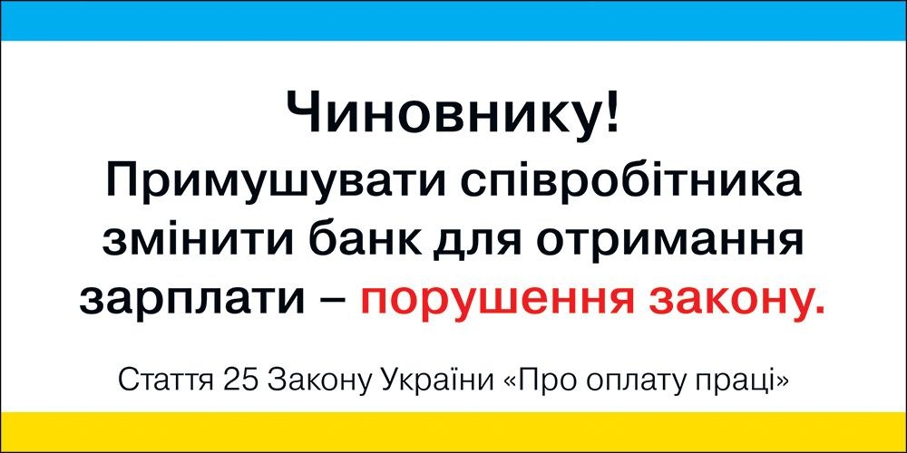 В первую очередь, организаторы акции обращают внимание на то, что Закон Украины «Об оплате труда» (ст.24 и ст.25) прямо указывают, что каждый человек вправе самостоятельно распоряжаться своей зарплатой и содержат прямой запрет кому бы то ни было мешать работнику распоряжаться зарплатой. Таким образом, администрация предприятия/организации при выборе обслуживающего банка должна максимально учесть интересы своих работников. При этом, нарушение принципа добровольного выбора банка и передача персонгальных данных работников банковским учреждениям без ведома человека ялвяется уголовным преступлением.