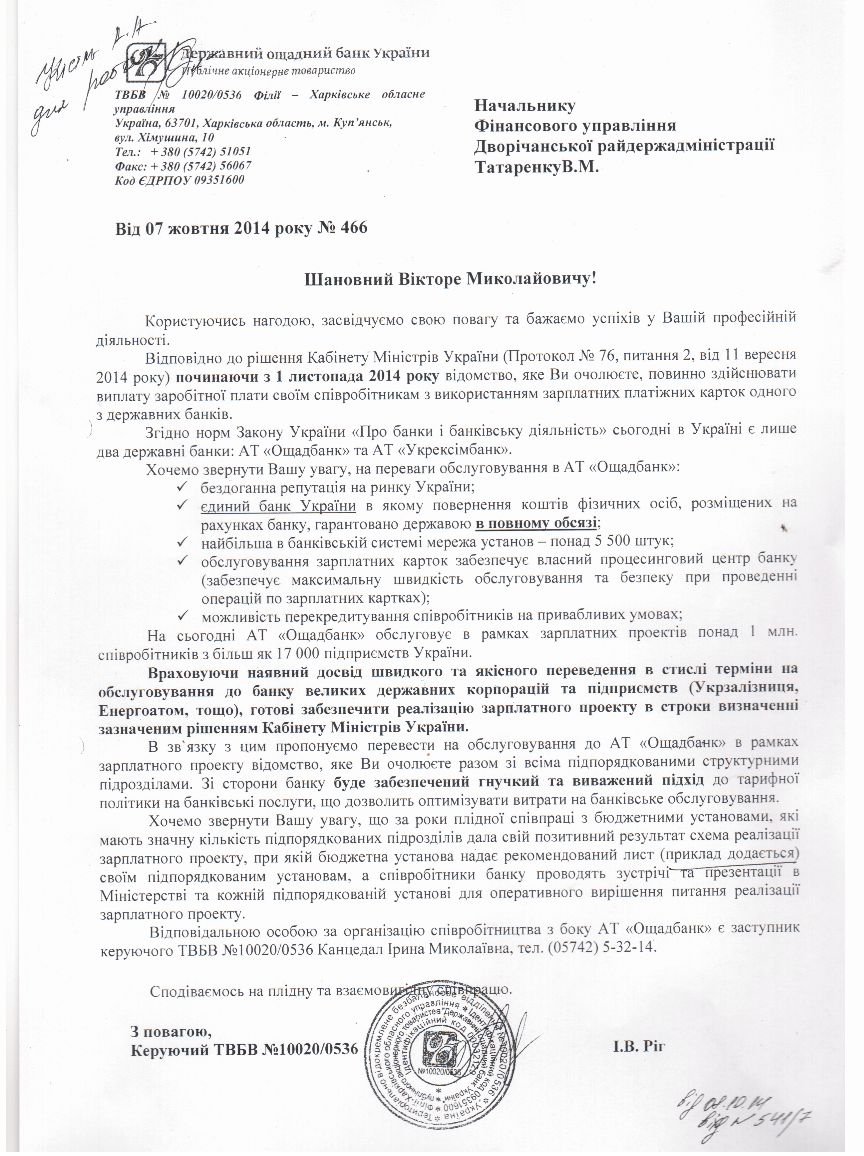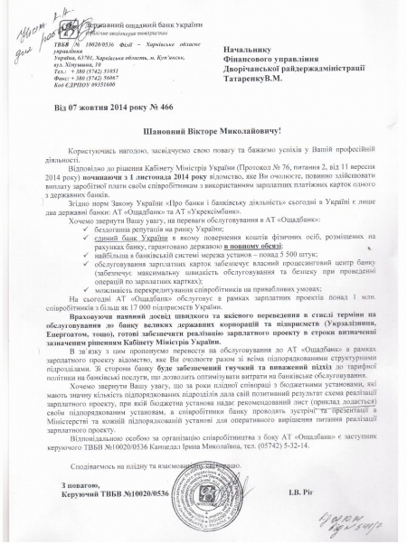 А пока госбанк балансирует на грани устойчивости, руководители всех уровней государственной власти получают вот такие “письма счастья”, в которых чиновникам настоятельно рекомендуют обеспечить перевод всех бюджетников в “сжатые сроки”. Пять миллионов украинцев рискуют пополнить ряды пенсионеров - завсегдатаев сберкасс, при этом никто даже не спрашивает их желания вернуться в банки образца 90-х годов прошлого века.