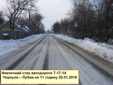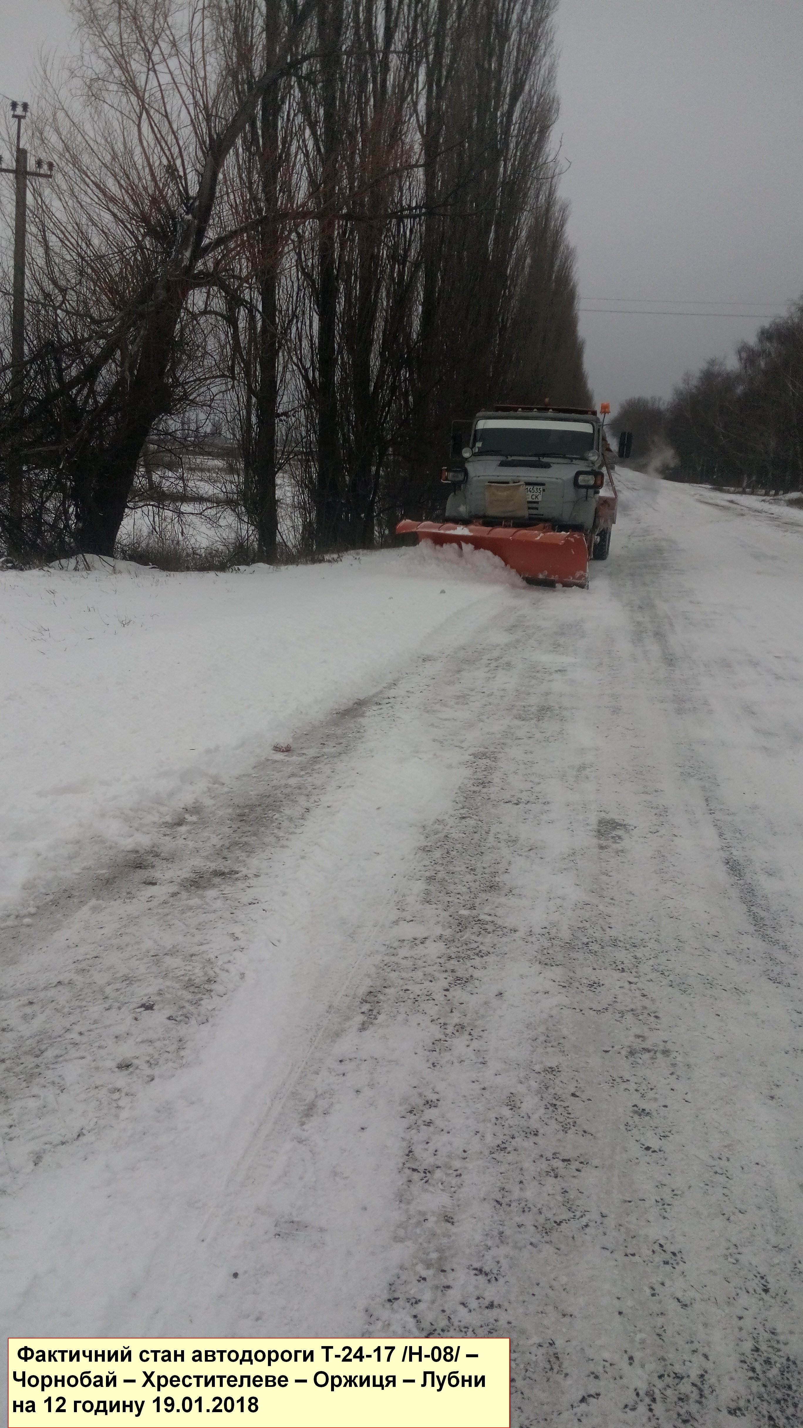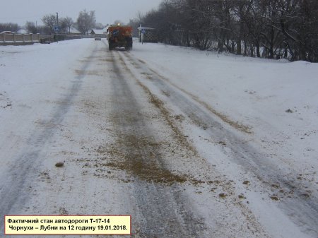 Обслуговування автомобільних доріг Лубенського району, які перебувають на балансі Служби автомобільних доріг у Полтавській області, здійснює на підставі договору ДП «Полтавський облавтодор». 19.01.2018 снігоочищення доріг і ліквідацію зимової слизькості на зазначених дорогах здійснено виключно філіями облавтодору у відповідності до нормативних вимог щодо якості та термінів.