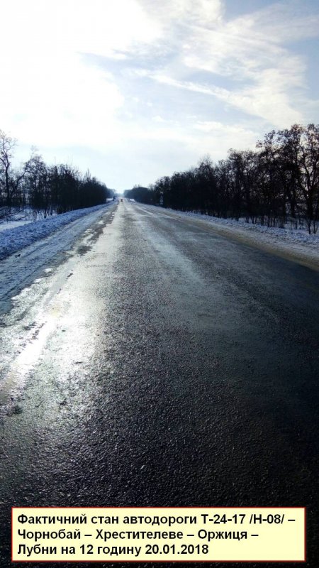 Відповідно до пункту 5.3.1 Технічних правил ремонту і утримання автомобільних доріг загального користування України П-Г.1-218-113:2009 та пункту 3.1.2 Єдиних правил зимового утримання автомобільних доріг П-218-118:2005 для дороги Т-24-17 /Н-08/ – Чорнобай – Хрестителеве – Оржиця – Лубни (III категорія) визначено ширину очистки проїзної частини від снігу – 80% і допустиму товщину снігового та сніжно-льодяного накату – 30 мм, для дороги Т-17-14 Чорнухи – Лубни (IV категорія) визначено ширину очистки проїзної частини від снігу – 70% і допустиму товщину снігового та сніжно-льодяного накату – 60 мм.