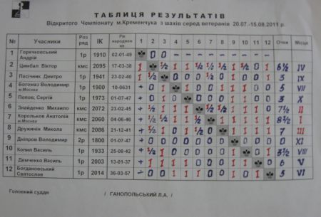 12 августа турнир был завершен. Чемпионом стал гость из Москвы, набравший 8,5 очков из 10 возможных – Анатолий Корольков, второе и третье место заняли кременчужане – самый Михаил Знайденко (7,5 очков) и Николай Дружинин (7 очков).