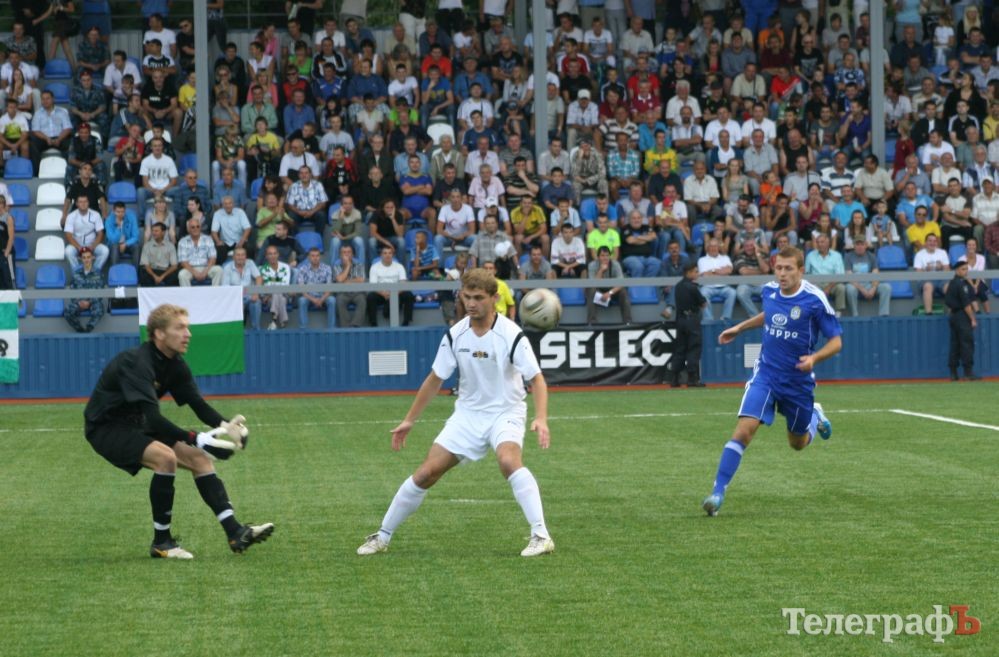 Но вернёмся к футболу. Первый же опасный момент у ворот «Полтавы» закончился взятием ворот. Климов тонким пасом нашёл в штрафной Рябцева и Сергей, прорвавшись к воротам под острым углом, выстрелил низом в дальний угол. Через 10 минут в подобной ситуации оказался Евгений Шаповал, но вот только пробил защитник «Кремня» прямо в руки Евгению Дейнеко. Тут же и «Полтава» ответила первым голевым моментом. Максим Зеленевич выстрелил издалека и мяч после его удара попал в стойку ворот, от которой ударился в спину Андрея Олейника. Обычно такие эпизоды заканчиваются голами, но в этот раз наш вратарь сумел быстро сориентироваться в ситуации и накрыть мяч. На 41-й минуте игроки «Полтавы» требовали от арбитра матча львовянина Юрия Суряка пенальти, так как считали, что Шаповал нарушил правила в штрафной против Олега Синегуба. Однако рефери кроме жёсткой, силовой борьбы ничего в этом моменте не усмотрел. На последних минутах первого тайма Олейник дважды блеснул мастерством, сначала переведя на угловой очень неудобный и опасный удар со штрафного Зеленевича, а затем и после углового, когда наши защитники проиграли верховую борьбу. Концовка тайма явно была за «Полтавой» и перерыв был очень необходим «Кремню», что бы, как говориться, перевести дух.