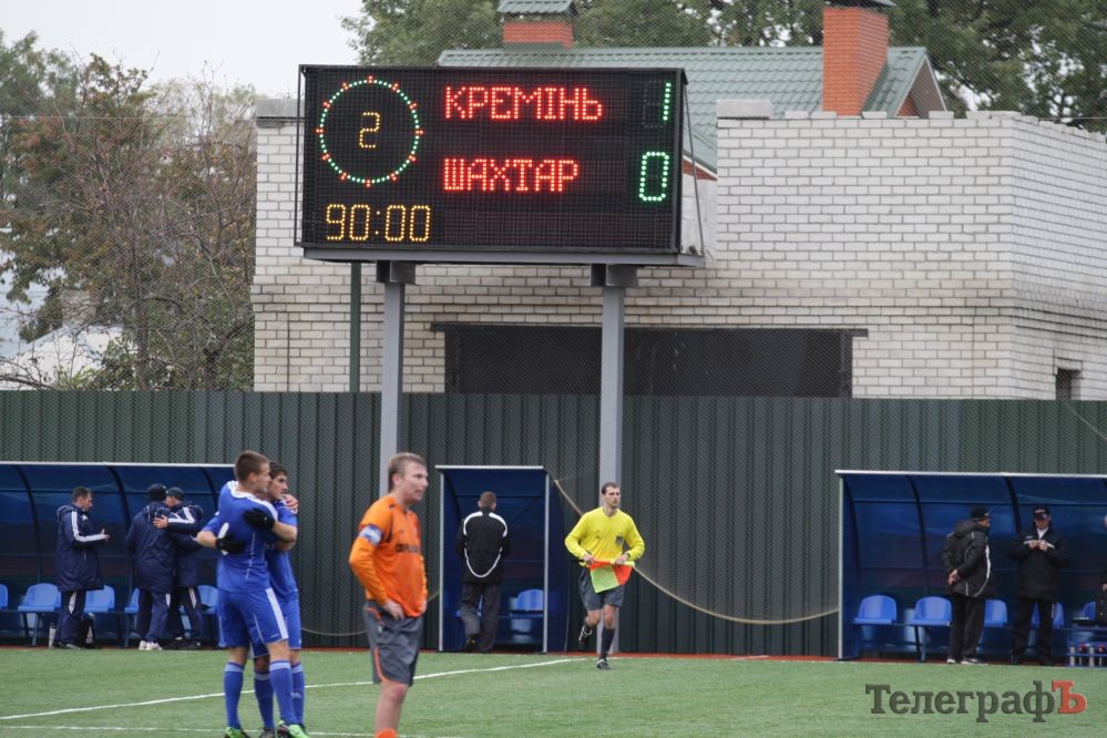 Уже на 7-й минуте «Кремень» мог проигрывать 0:1, если бы Андрей Поляница смог замкнуть дальнюю штангу, после подачи углового. Но защитник «Шахтёра» промазал из выгодной позиции. В целом обе команды начали игру без особого форсажа, не несясь сломя голову в атаку, стараясь постепенно нащупать слабые стороны в обороне соперника. В конце первого тайма два эпизода заставили понервничать зрителей на трибунах. На 38-й минуте Евгений Шаповал едва не срезал головой мяч в свои ворота, пытаясь прервать фланговый прострел. А на 44-й минуте, после ошибки на выходе Старцева в штрафной «Шахтёра» возник настоящий футбольный пожар, который, к сожалению, закончился выносом мяча защитниками, а не точным ударом в ворота, кого-нибудь из из игроков «Кремня».