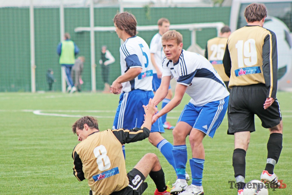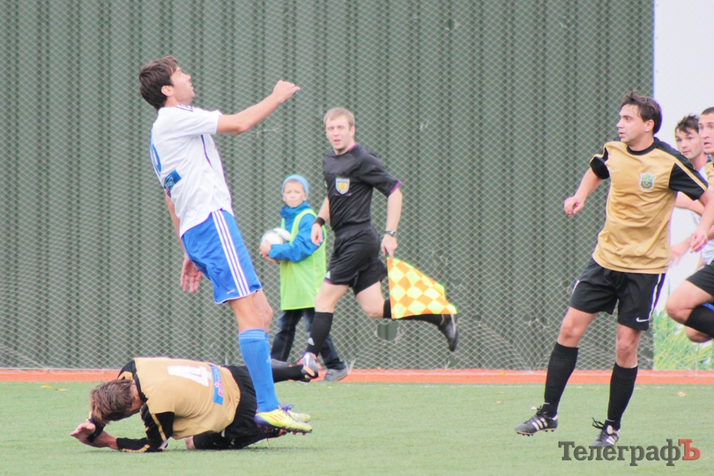 На 90-й минуте не выдержали нервы у игрока гостей, который в центре поля во время остановки игры двумя ногами ударил нашего капитана Олега Шевченко и был удалён с поля.