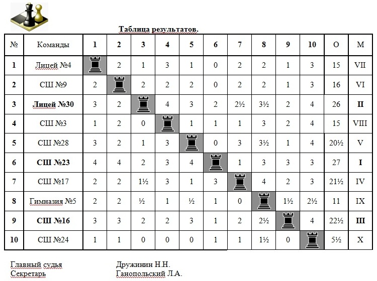 В борьбе за призовые места лидерами выступили команды лицея №30, СШ №16, СШ №23, СШ №17 и СШ №28. В последнем, девятом туре, после напряженной борьбы, были определены победители: на первое место вышла команда СШ №23, какая набрала 27 очков; лишь на один пункт меньше набрала команда лицея №30, получив второе место; а третье место досталось команде СШ №16.
