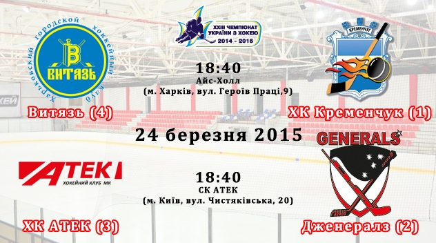 24 березня матчами в Харкові та Києві стартують півфінальні серії ХХІІІ чемпіонату України з хокею. «Витязь», який займає четверту сходинку турнірної таблиці, на своєму майданчику прийматиме переможця регулярного чемпіонату ХК «Кременчук», а «АТЕК» поміряється силами з «Дженералз».
