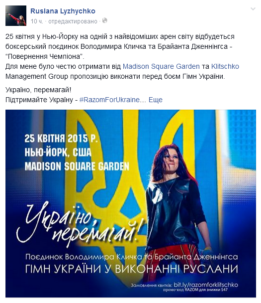 Перед боем Кличко – Дженнингс гимн Украины будет исполнять Руслана