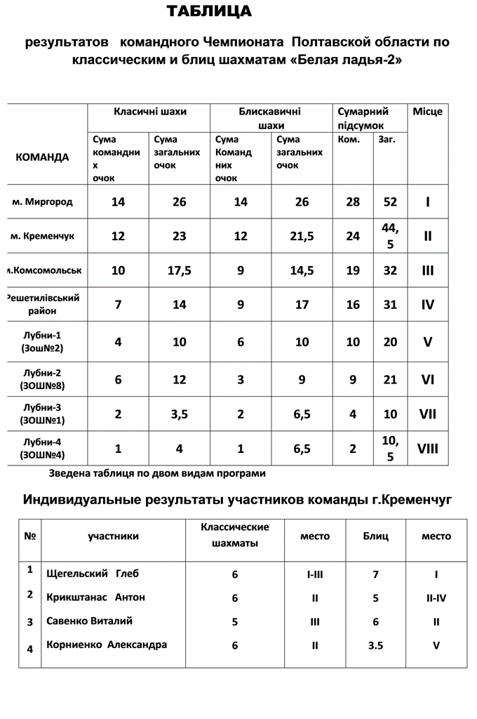 За результатами усіх турнірів (24 командних очок з 44,5 загальних) команда Кременчука посіла друге місце, поступившись першістю команді Миргорода.