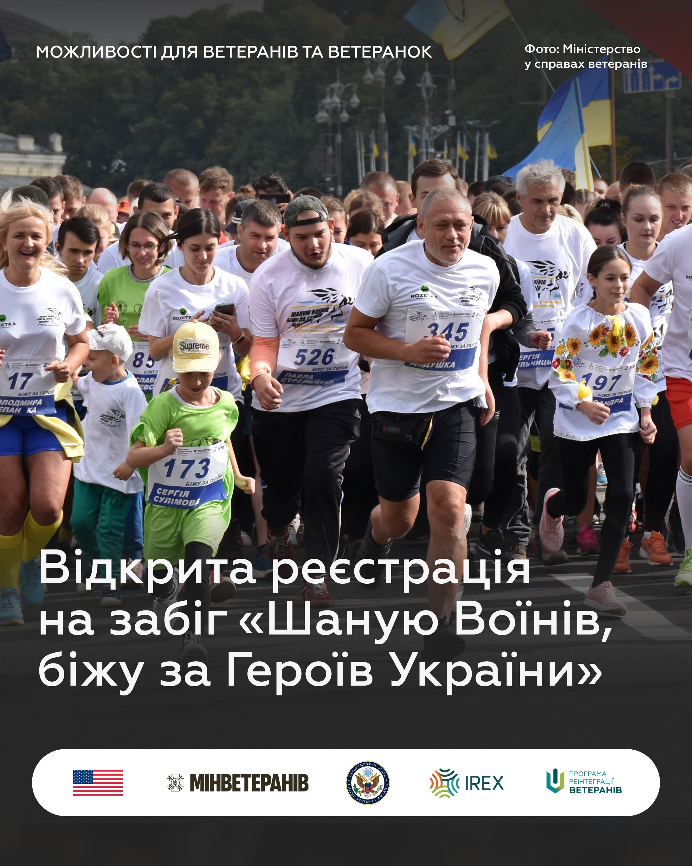 Мінветеранів запрошує всіх охочих долучитися до Всеукраїнського забігу «Шаную Воїнів, біжу за Героїв України». Щороку тисячі людей долучаються до неї, щоб вшанувати пам’ять тих, хто віддав життя за свободу й незалежність України. Забіг приурочений до Дня пам’яті захисників України, що відзначається 29 серпня.