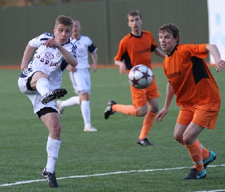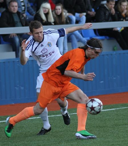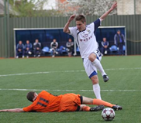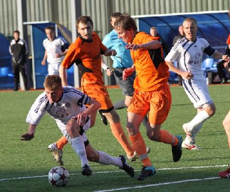 Вовченко пропускает мяч между ног, но защитники этот маневр прочитали