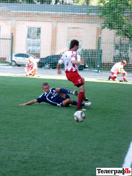 Счёт в игре был открыт довольно быстро. Мяч попал в руку кому-то из защитников гостей и Владимир Коновальчук, который пробовал себя в качестве рефери, указал на «точку». Пенальти чётко исполнил Евгений Апришко. Буквально через несколько минут «Кремень» увеличил своё приемущество в счёте. Виталий Собко воспользовался оплошностью соперников в обороне и вышел один на один с вратарём. Не сближаясь с голкипером Собко проткнул мяч мимо него и счёт стал 2:0. Ближе к концу тайма «Горняк-Спорт» сумел отыграть один мяч. Ситуация, которая привела к голу, была похожа на ту, после которой случилось первое взятие ворот. Мяч в штрафной «нашёл» руку игрока «Кремня» и Коновальчук, немного подумав, всё же решил дать возможность и гостям пробить пенальти. Роман Чумак угадал направление удара капитана комсомольчан Евгения Сливы и даже коснулся мяча кончиками пальцев, но отбить удар не смог.