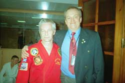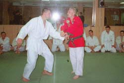 «В вашем городе большое количество охранных структур на предприятиях, в том числе и в УПМДН, в зале которого проходит заниятие, – отметил Александр Гартвич. Вторым фактором выбора Кременчуга стало создание в городе областной федерации рукопашного боя и её местного филиала». Охраняя покой граждан и материальное добро предприятий, люди в униформе зачастую подвергаются смертельной опасности. Джим Брайсон умеет уклоняться от пуль. ножа и любого другого лоружия. Поразительная реакция (Брюс Ли), несходящая с лица улыбка (Джеки Чана) и удивительная лёгкость в обезвреживании вооружённого противника. В Японии Мастер поразил коллег, бросая играючи (при собственном весе 80 кг) 150-тикилограммового спарринг-партнёра. Гартвич собственными глазами видел, как Джим остановил сердце человека, а затем снова «запустил» его в работу. Он может вырвать кадык, словно сорвать розу, сломать хребет, одним движением парализовать человека, разобраться с противником, приставившим к его телу пистолет, ни разу не подставиться под град ударов, находясь вплотную с противником…