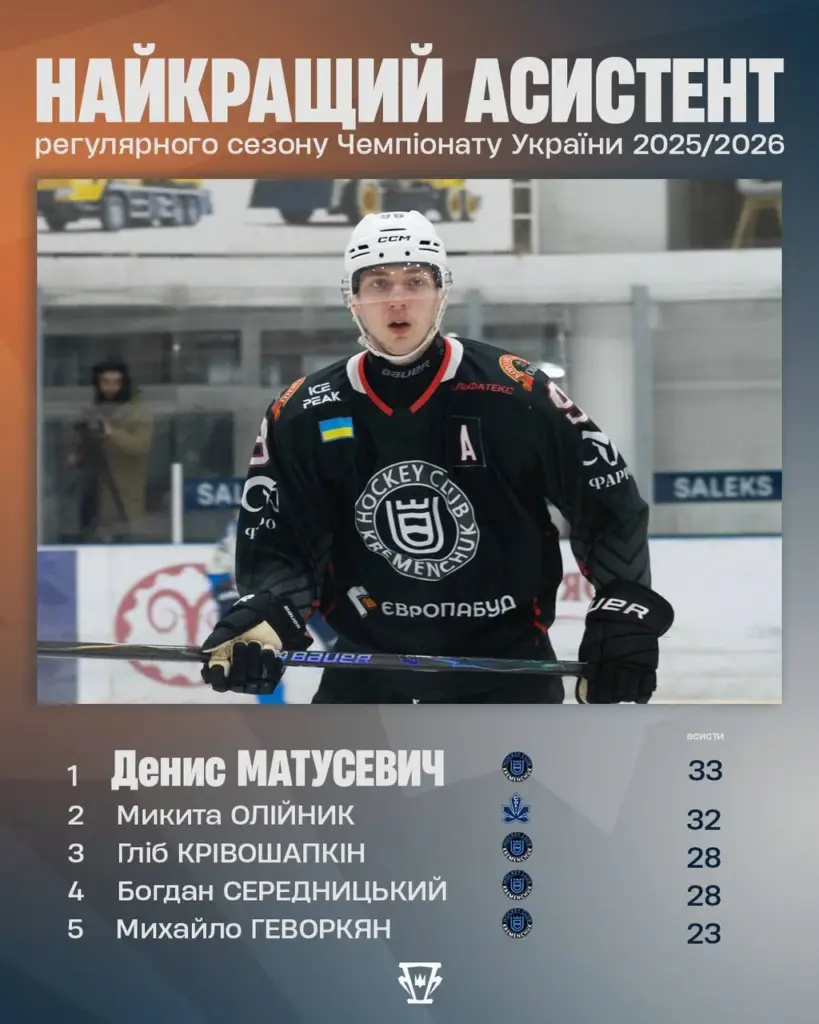Ще один представник кременчуцької команди Денис Матусевич став найрезультативнішим захисником чемпіонату. У його активі 40 очок — 7 шайб і 33 асисти. Він також став найкращим асистентом сезону серед оборонців.