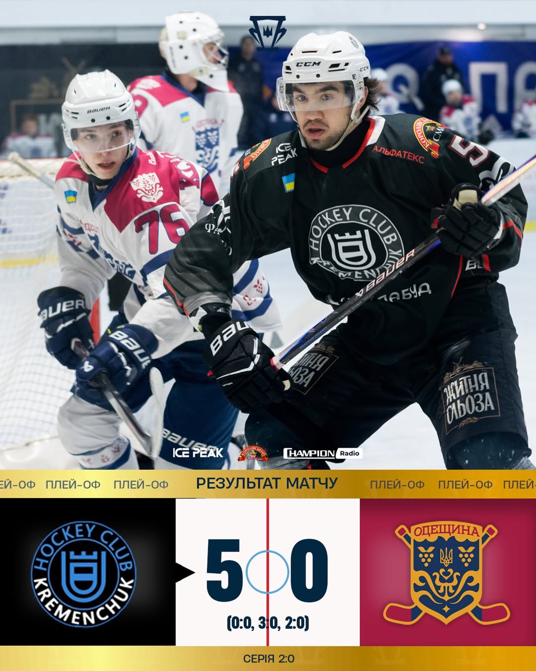 ХК «Кременчук» здобув перемогу над «Одещиною» у другому матчі серії плейоф чемпіонату України з хокею, який відбувся 12 березня. Гра завершилася з рахунком 5:0. Про це повідомляє пресслужба Федерація хокею України.