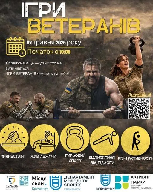 Вперше у Кременчуці планують провести силові змаганнях «Ігри ветеранів». Захід відбудеться у суботу, 2 травня. Початок – о 10.00. Місце проведення змагань повідомлять додатково всім зареєстрованим учасникам. Про це інформує пресслужба Кременчуцької міської ради.