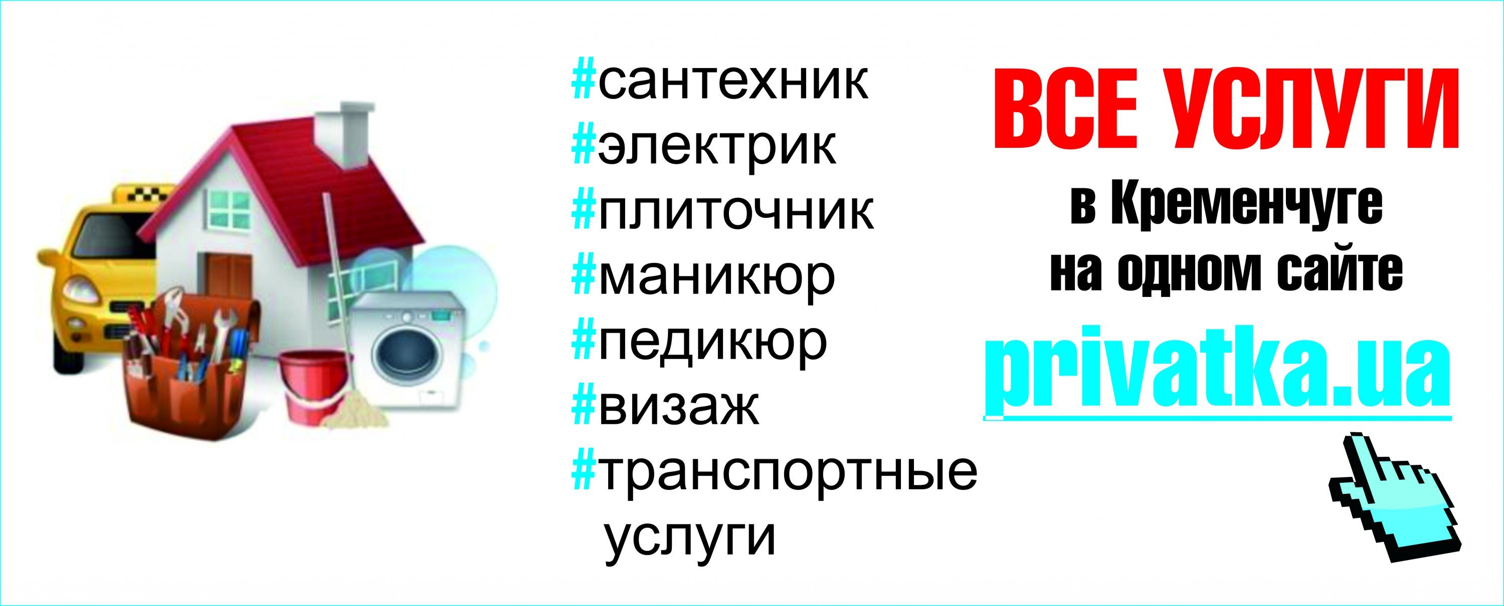 Отдельно отмечаем рубрику УСЛУГИ в Кременчуге. Если возникнет аварийная ситуация, Вы всегда сможете найти на сайте privatka.ua проверенных мастеров. Более 1500 предложенийот сантехников, электриков, поваров, юристов, ведущих праздников, доставка доваров, автотранспортные услуги, ремонт авто, ремонт систем отопления, водоснабжения и много других подрубрик сберегут Вам нервы по поиску мастера в Кременчуге.