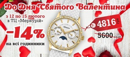 Тільки з 12 по 15 лютого для всіх закоханих та всіх бажаючих – знижка 14% на всі годинники в ТДЦ Меркурій!