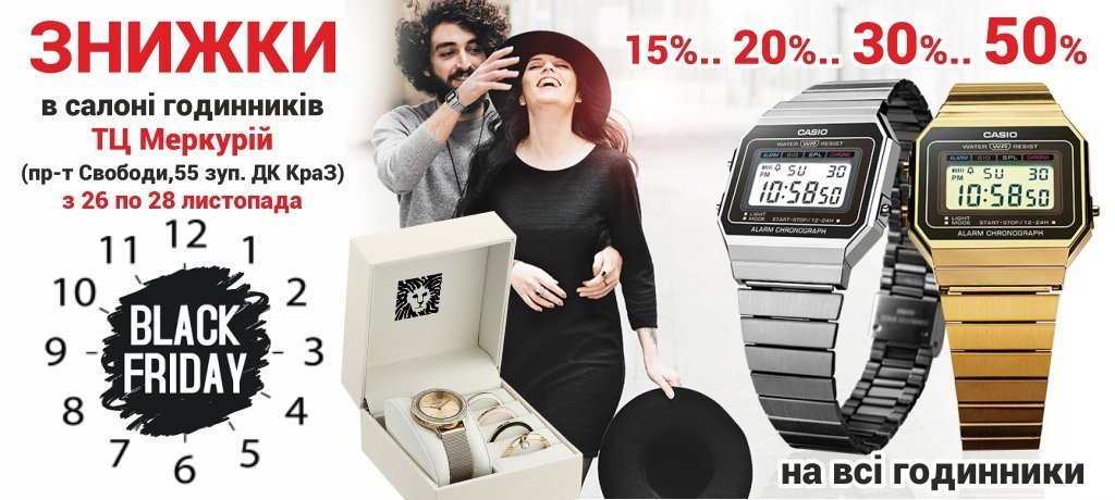 Опубліковано вРеклама-акції Black Friday 21! Знижки на всі годинники від 15% до 50% з 26 по 28 листопада в салоні годинників ТЦ Меркурій by на правах реклами25-11-2021, 11:00 Black Friday-21 з 26 по 28 листопада в салоні годинників ТЦ Меркурій! Знижки на всі годинники -15%, -20%, -30% та -50%