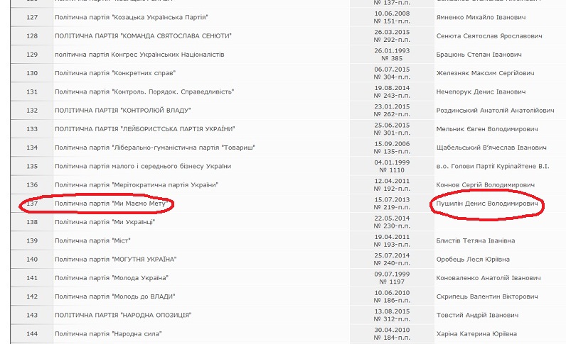 Партия Дениса Пушилина в списке вероятных участников местных выборов в Украине