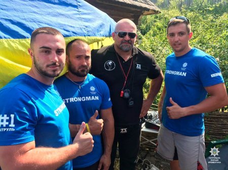 Кременчуцькі правоохоронці змагалися у 5 вправах та зробили селфі з найсильнішою людиною світу Василем Вірастюком. На фото зліва: Ян Сосніцький, Максим Безклинський, Василь Вірастюк та Максим Галицький.