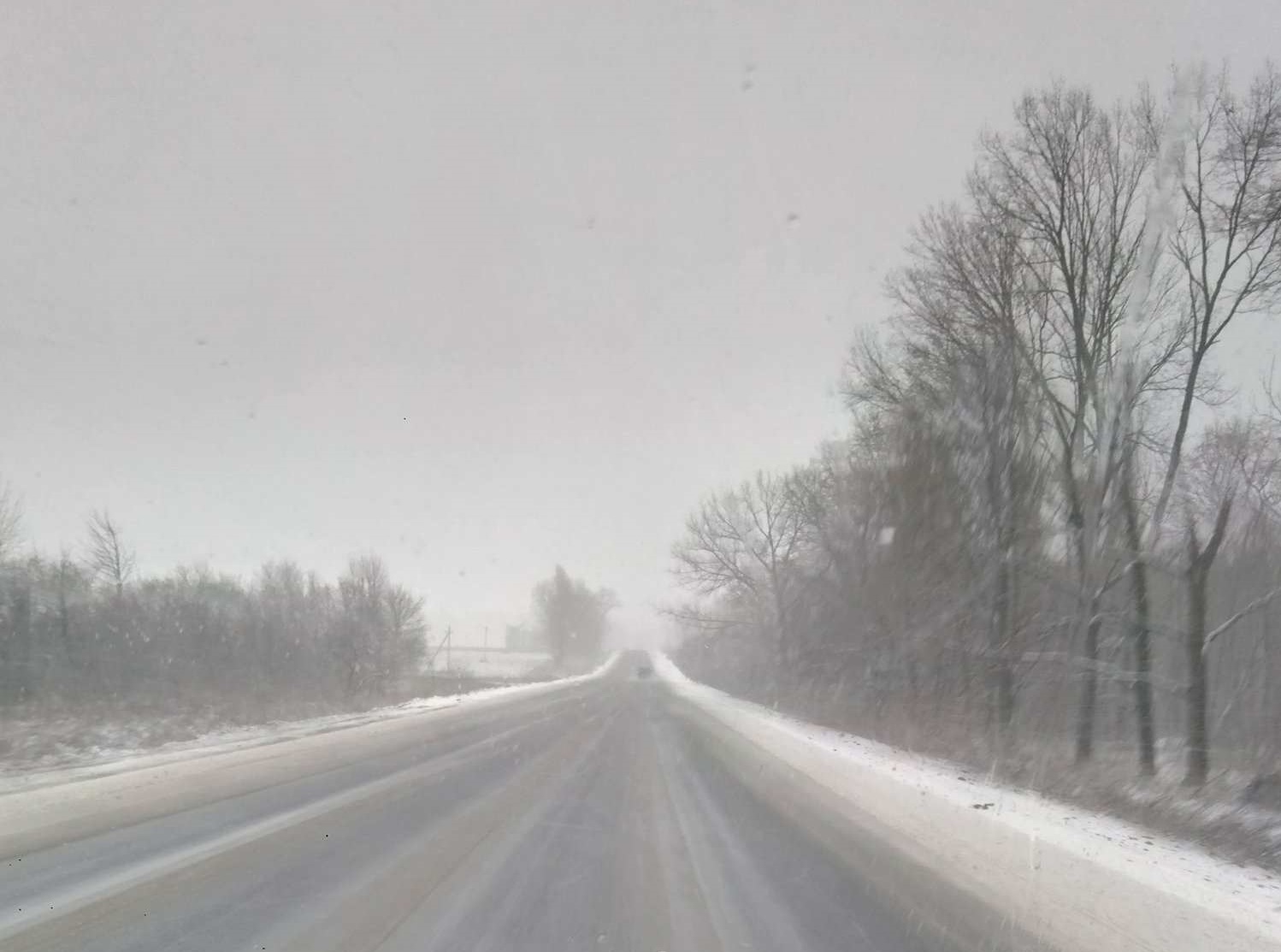 Начиная от Новых Санжар дорогу уже заметает. Видимость ухудшается