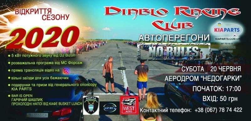 Поблизу міста Кременчука, на аеродромі у Недогарках, відбудеться щорічне відкриття авто перегонів «Diablo Racing Club & No Rules 2020», засновані братами Однороженко.