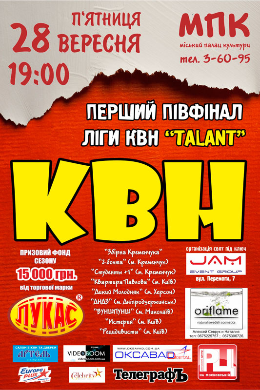 Билеты на концерты, представления и популярные вечеринки в городе "Кременчугский ТелеграфЪ" разыгрывает постоянно — следите за обновлениями на сайте. Нажимайте на кнопку ВЫИГРАЙ БИЛЕТЫ.