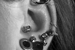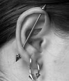 Пірсінг вух – найбільш ліберальний прояв. У американських індійців вуха кололи чоловікам.Проколи робилися як в мочках, так і в хрящах. У представників європеоїдної раси ця прерогатива довгий час залишалася у жіночої половини. Хоча в царській Росії сережку у вухо вставляли матросу, що вперше перетнув екватор. (Серйозна подія в кар’єрі матроса – серйозна відзнака.) У Британії 70-х форма сережки пройшла всі стадії, які тільки може допустити уява. Але перевага все-таки віддавалася англійській шпильці. І якщо до недавнього часу наш співвітчизник, володар сережки, прирікав себе на звинувачення з боку громадськості в гомосексуальній орієнтації, то зараз,все змінилося. Маючи навіть незчисленну кількість кілець в районі слухового апарату, ви менше всього нагадуватимете інопланетянина або який-небудь пекельний механізм і зможете спокійно ходити по вулицях.