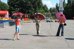 А вот затея флеш-моба «Зонтики» провалилась в самом начале. Зачинщик, который придумал собрать в жаркий летний день на площади Независимости людей с зонтиками, сам не явился. Но это вовсе не огорчило троих заядлых флеш-мобберов, которые все-таки пришли. Взявшись за руки, под зонтиками они двинулись в сторону Приднепровского парка, по дороге веселя своим видом прохожих.