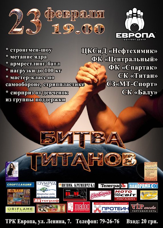 «Кременчугский Телеграф» разыгрывает 10 билетов на спортивно-развлекательный батл ко Дню защитника Отечества «Битва титанов Европы» который состоится 23 февраля в ТРК «Европа».