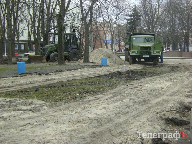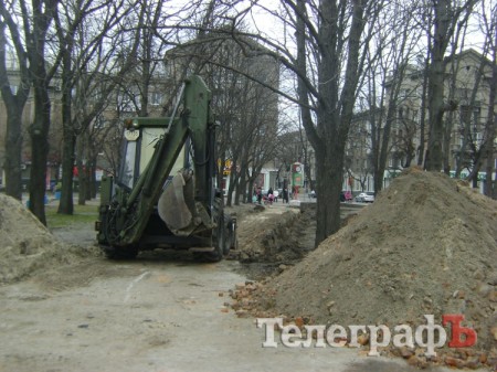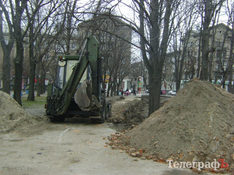 Уже с неделю в центре, проходя мимо сквера «Октябрьский», кременчужане видят большие «раскопки»: работает экскаватор, грузовые машины, вокруг кучи песка. Строители демонтировали старые лавочки со стороны улицы Пролетарской и срывают бетонные плиты, которыми были вымощены дорожки.