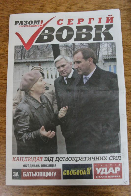 «Телеграф» отримав нову газету під назвою «Разом переможемо! Сергій Вовк*». Газету розкидали по під’їздах на 12-му виборчому окрузі Кременчука. На її титульній сторінці розміщене велике групове фото – пенсіонерки (куди без них), міський голова пан Бабаєв (куди без нього) і пан Вовк – кандидат до Кременчуцької міської ради по виборчому округу №12. Дванадцятий округ – колишній округ нардепа Шаповалова, 3 лютого там мають відбутися вибори на заміщення вакантної посади депутата міськради. Відповідно, кандидат Вовк на даний момент – суб’єкт виборчого процесу, і закон обмежує його право застосовувати у передвиборчій боротьбі адмінресурс. Між тим, постать мера в агітаційному виданні займає половину обсягу фотографії, сам кандидат Вовк лише чемно виглядає з-за плеча посадовця.