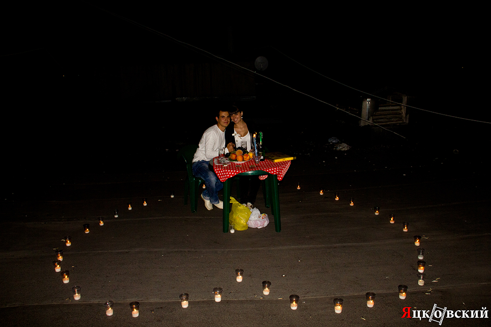 Живу я в 9-этажном доме. Мне удалось с помощью друга достать ключи от крыши. Я там убрал. Вынес на крышу стол, стулья. Накрыл на стол. Вокруг столика я выложил более 50 свечей в форме сердца. Была одна проблема, ветер задувал свечи. Мне пришлось подключить смекалку. Каждую свечу я ставил в одноразовый стаканчик, таким образом проблема была решена!