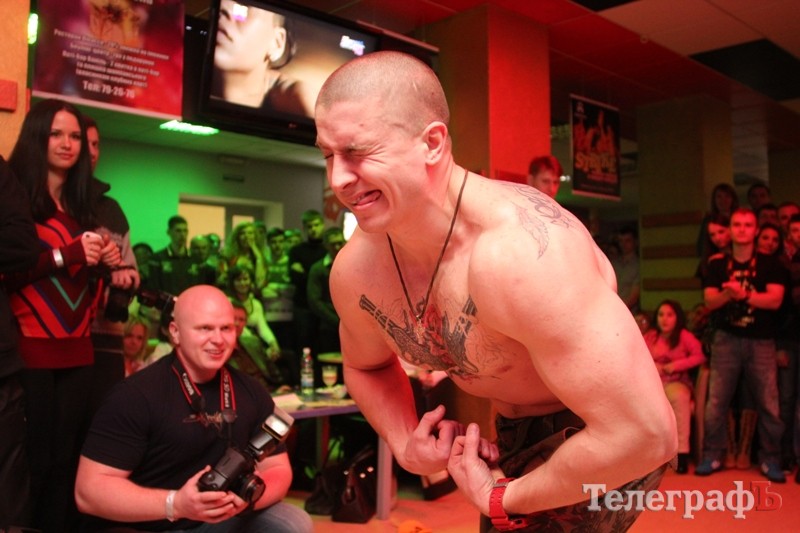 В третьем конкурсе – стронг-мэн шоу спортсмены демонстрировали свои мышцы жюри и всему зрительному залу. Один из них – Александр Невмывака даже показал элементы стрип-пластики. А два спортсмена СК «Балу» - Евгений Соловей и Артем Макагон кроме мышц продемонстрировал многочисленные татуировки на своем спортивном теле.