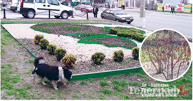 За відповіддю, отриманою на запит, у 2012 році на клумбі висадили 40 кущів барбарису Тунберга. «ТелеграфЪ» досліджував клумбу двічі – восени 2012-го та 8 квітня 2013-го. Барбарису ми там жодного разу не бачили. Замість нього знайшлося 30 кущів самшиту та однорічну цинерарію морську восени і тюльпани навесні.