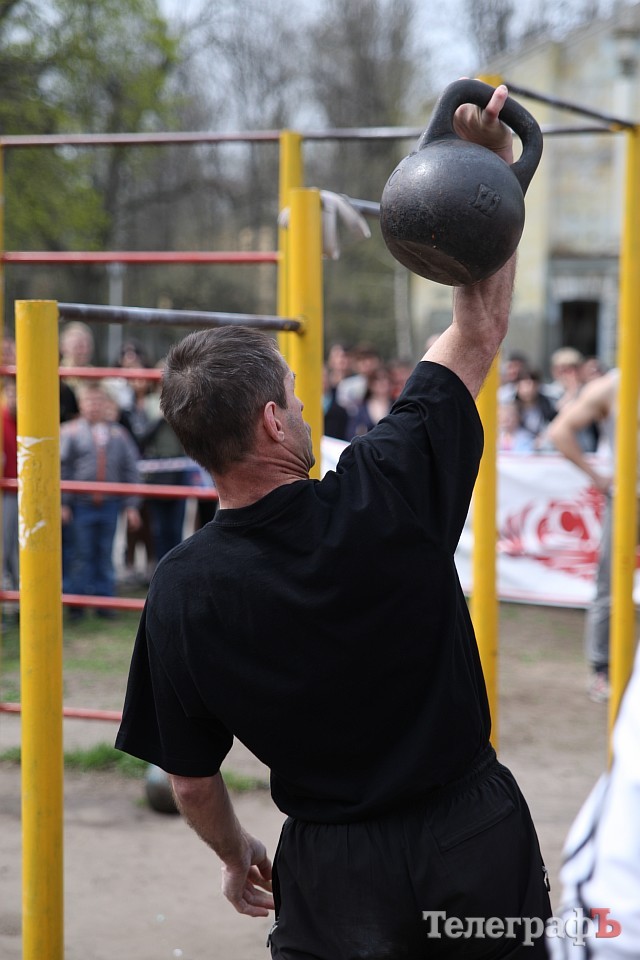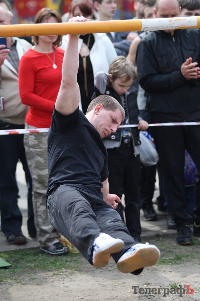 На следующем этапе спортсмены, уже взрослые, соревновались между собой в подтягивании на турнике с гирей весом 24 кг. Победителем стал кременчужанин Влад Костенко, который продемонстрировал лучший результат – 14 подтягиваний.