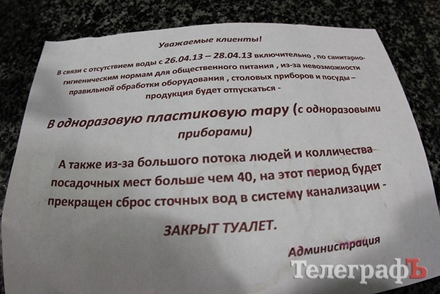 В дни, когда Кременчуг будет отключен от водоснабжения (26-28 апреля), учреждения сферы обслуживания — кафе, рестораны, бары, парикмахерские частично изменят график работы.