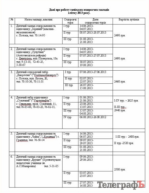 «ТелеграфЪ» печатает стоимость туров, их сроки и телефоны детских оздоровительных пригородных лагерей