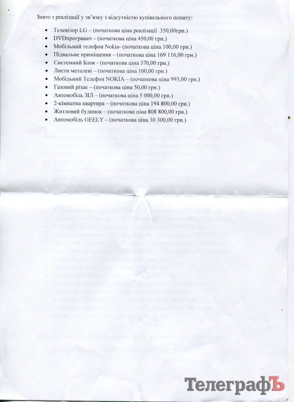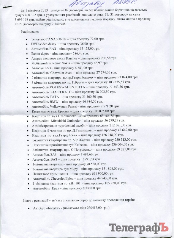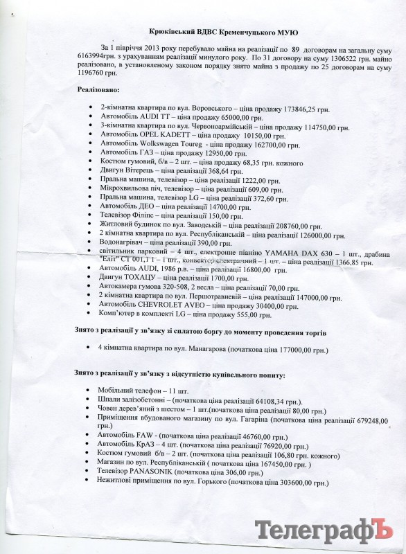 Крюковский отдел государственной исполнительной службы (ОГИС) предоставил отчет, в котором указано, что двухкомнатная квартира по улице Воровского была продана за 173 тыс грн, трехкомнатная на Раковке — за 115 тыс грн, автомобили АUDI — за 65 тыс грн, OPEL - за 10 тыс грн.