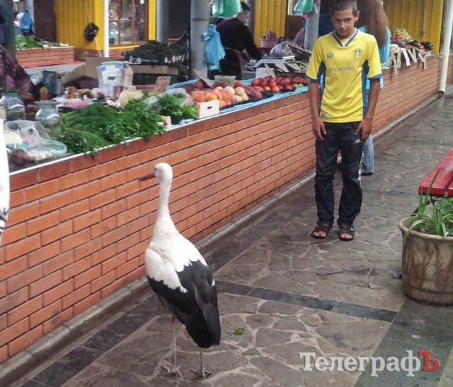 В выходные на центральном рынке Кременчуга горожане с удивлением наблюдали, как между рядами ходит аист. Он не боится людей и охотно с ними «общается». Кременчужане подкармливают его рыбой.