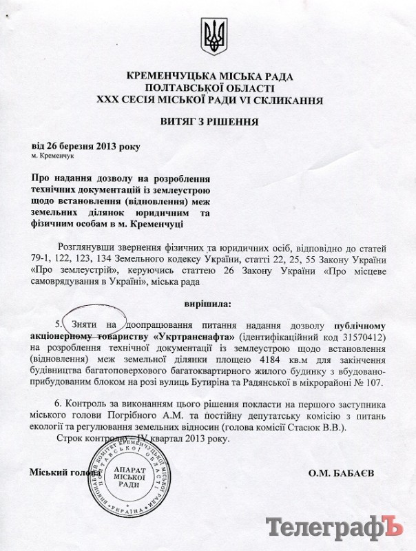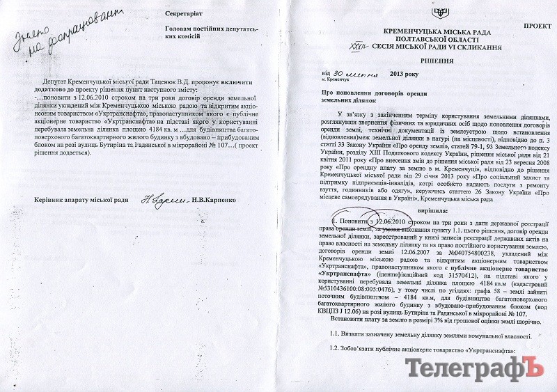 Что же могло так кардинально изменить позицию кременчугской власти: то даю, то не даю землю? То важно, что там люди и их квартиры, то не важно? По версии «Телеграфа», решающую роль в такой смене позиции могло сыграть письмо директора «Укртранснафты» г-на Козака, где он подтверждает, что его предприятие не возражает против передачи своей части телевышки в коммунальную собственность. Письмо г-на Козака датировано 23.07.2013 – оно пришло за неделю до сессии горсовета. И 24 июля на комиссиях вдруг всплыл вопрос о передаче в аренду «Укртранснафте» земельного участка в придачу с людьми и их квартирами. ![]()