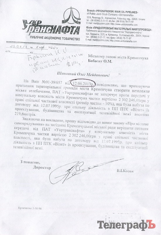 «На ваш запрос № 01-39/657 сообщаю, что, учитывая стремление территориальной общины Кременчуга создать независимое городское телевидение, ПАТ «Укртранснафта» не возражает против передачи в коммунальную собственность города Кременчуга части стоимостью 2 302 246,00 грн. (50%)...».