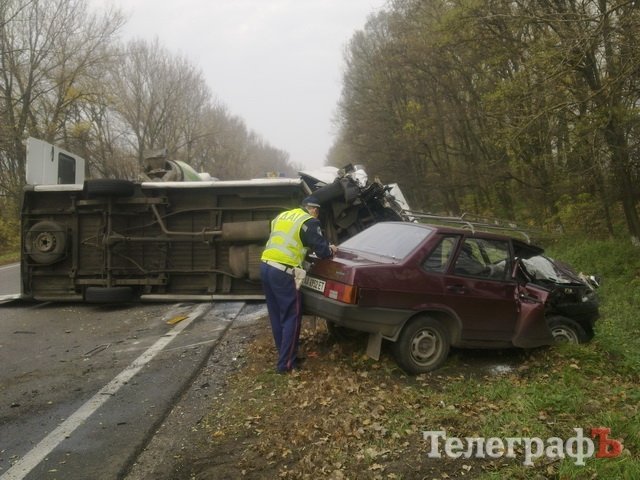 С места ДТП в больницу госпитализированы два человека: водитель «девятки» (закрытая черепно-мозговая травма и ушиб грудной клетки) и пассажирка маршрутки «Кременчуг-Киев» 1988 г.р., жительница Светловодска (закрытая черепно-мозговая травма).