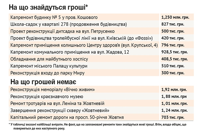 У мерії обіцяють віднайти гроші на капремонт будинку №5 у провулку Олега Кошового та продовження будівництва школи-садка у 278-му кварталі. Проте про ремонт дороги на проспекті 50-річчя Жовтня забули – зараз немає необхідних 700 тис. грн.