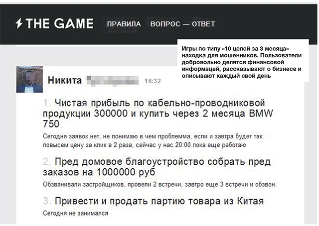 Игры по типу «10 целей за 3 месяца» находка для мошенников. Пользователи добровольно делятся финансовой информацей, рассказывают о бизнесе и описывают каждый свой день