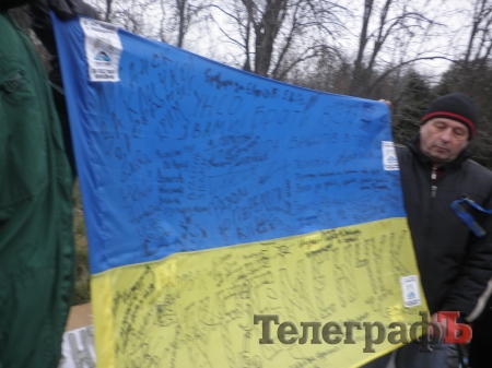 Активисты, приехавшие с Майдана в Киеве, привезли в качестве привета флаг Украины с подписями и хорошими пожеланиями для кременчужан от тех, кто стоит на Евромайдане. И не только украинцев, но и грузинов, и даже от представителя Нидерландов. Говорили о теплой атмосфере, которая царит в Киеве на главном Евромайдане, и о том, что люди там стоят не за деньги, а за идею. И снова встал вопрос о том, почему же, в отличие от других городов, мэр Кременчуга не выходит к людям.