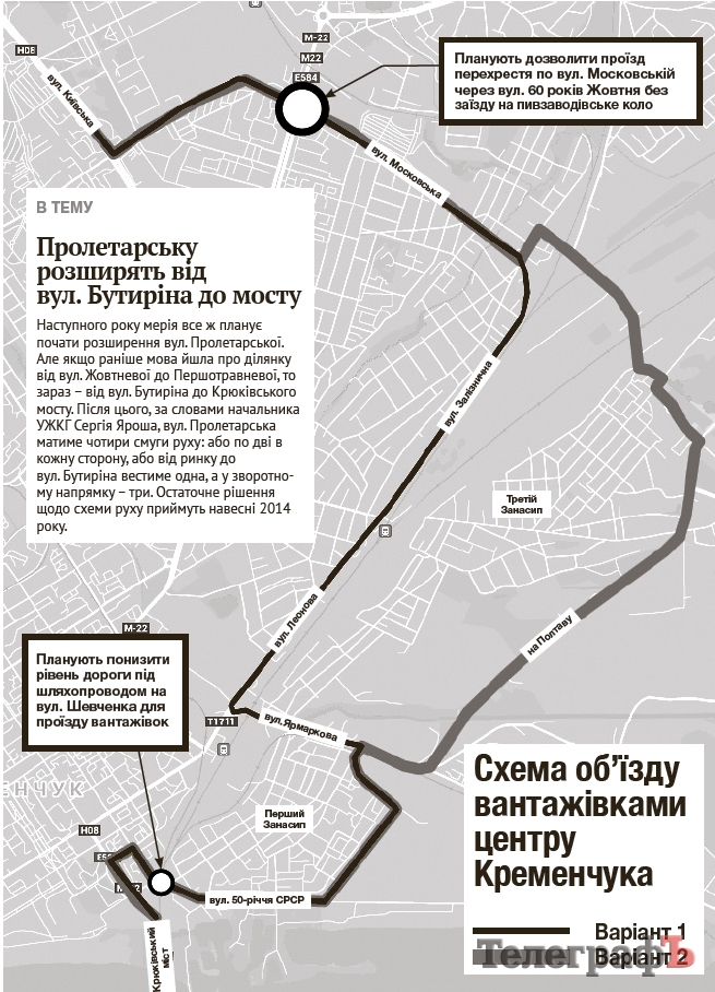 Аби вирішити проблему із заторами в центрі Кременчука, причиною яких часто стає транзитний великовантажний транспорт, що рухається вул. Пролетарською та Першотравневою і в спеку руйнує дороги, в мерії реанімували ідею створення об’їзного маршруту. Так, фури направлять з Крюківського мосту в об’їзд центру – через Перший Занасип.